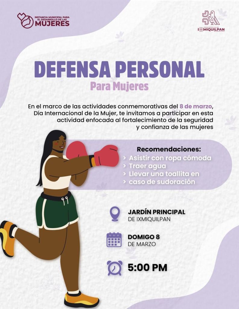 En el marco del Día Internacional de la Mujer, en Ixmiquilpan se llevará a cabo la actividad Defensa Personal para Mujeres, un espacio que busca fortalecer la seguridad, la confianza y el bienestar de las mujeres.