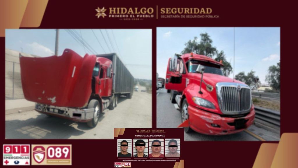 Pachuca, Hgo.-Dos hombres originarios del Estado de México y dos más de nacionalidad extranjera fueron asegurados por la Secretaría de Seguridad Pública de Hidalgo (SSPH), señalados como presuntos responsables de robos a transporte de carga en tramos carreteros federales del municipio de Tepeji del Río.