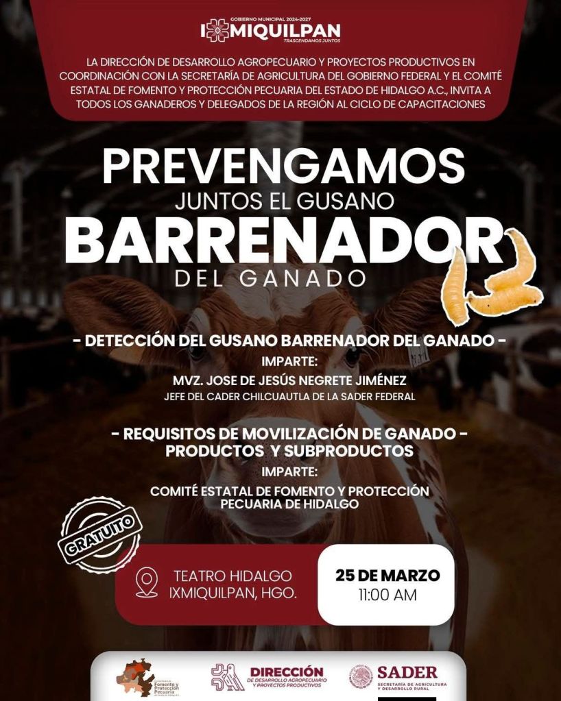 📣 El Gobierno Municipal de Ixmiquilpan en coordinación con La Dirección de Desarrollo Agropecuario y Proyectos Productivos, hacen la cordial invitación a todos los Ganaderos y Delegados de la Región a la Capacitacion de “Prevengamos Juntos el Gusano Barrenador del Ganado” 🐄 🐛 ‼️