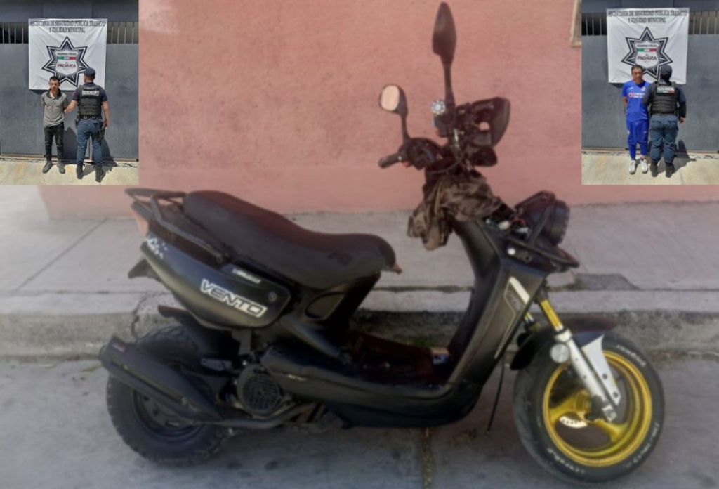 Pachuca. Hgo. – Durante un recorrido de vigilancia en la colonia Parque de Poblamiento, elementos de la Secretaría de Seguridad Pública, Tránsito y Vialidad de Pachuca detectaron una motocicleta marca Vento, color negro, en circulación con dos masculinos a bordo.